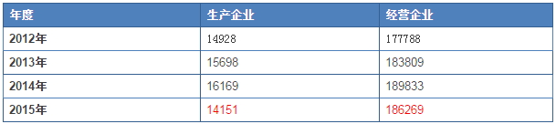 表1:医疗器械2012~2015年生产许可和经营许可总量表