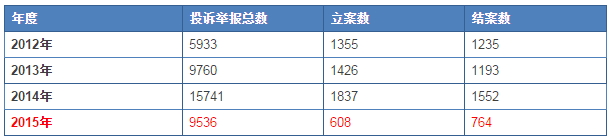 2015,受理医疗器械投诉举报9536件,立案608件,结案764件。