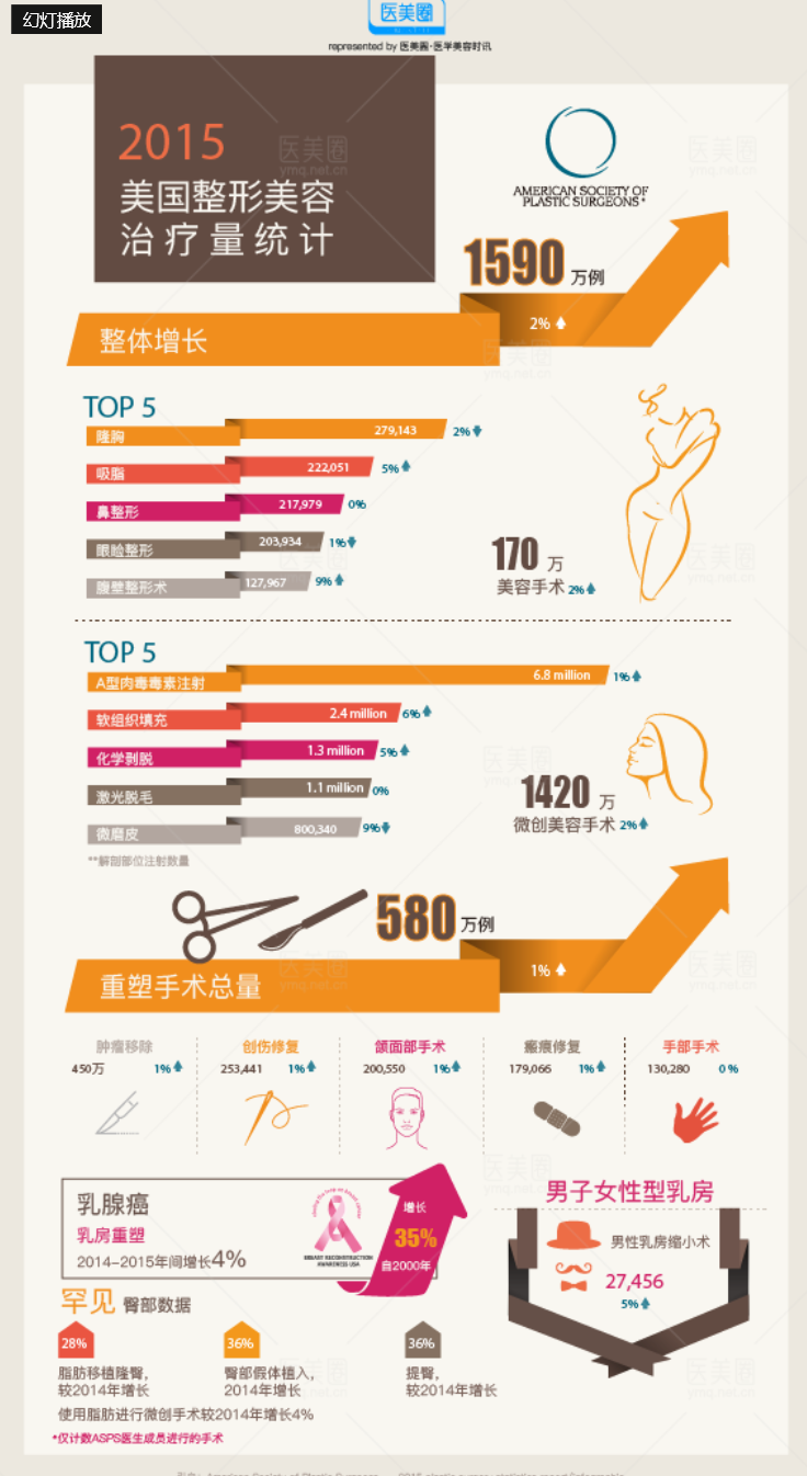 美国整形外科医师协会(ASPS)于2016年2月26日公布了年度整形外科手术统计,数据显示,美国2015年美容手术量为1590万例(包括手术和微创手术),较2014年增加了2%。