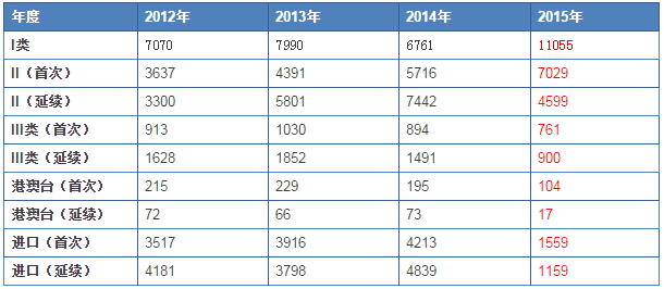 通过以上表格,我们可以发现2015年I类备案数目激增,II类首次注册数目也有所增加,其他项目的数目均出现减少。尤其是进口产品首次注册和进口产品延续注册数目减少近50%。